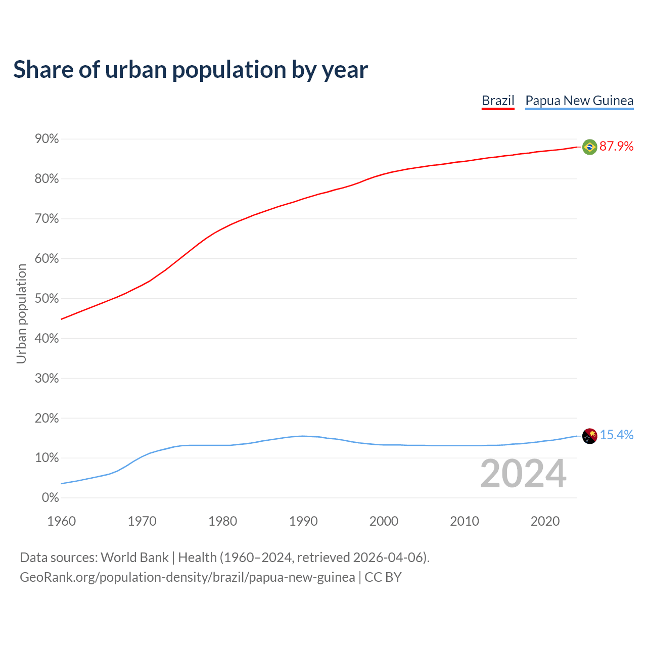 From 2004 to 2024, the share of urban population changed from 82.7% to 87.9% in Brazil and from 13.1% to 15.4% in Papua New Guinea.