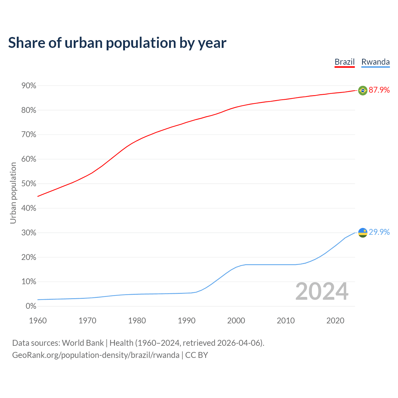 From 2004 to 2024, the share of urban population changed from 82.7% to 87.9% in Brazil and from 16.9% to 29.9% in Rwanda.