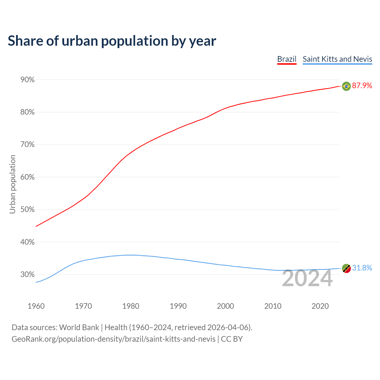 From 2004 to 2024, the share of urban population changed from 82.7% to 87.9% in Brazil and from 32.1% to 31.8% in Saint Kitts and Nevis.