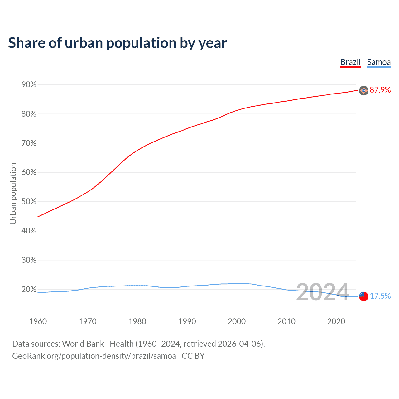 From 2004 to 2024, the share of urban population changed from 82.7% to 87.9% in Brazil and from 21.5% to 17.5% in Samoa.