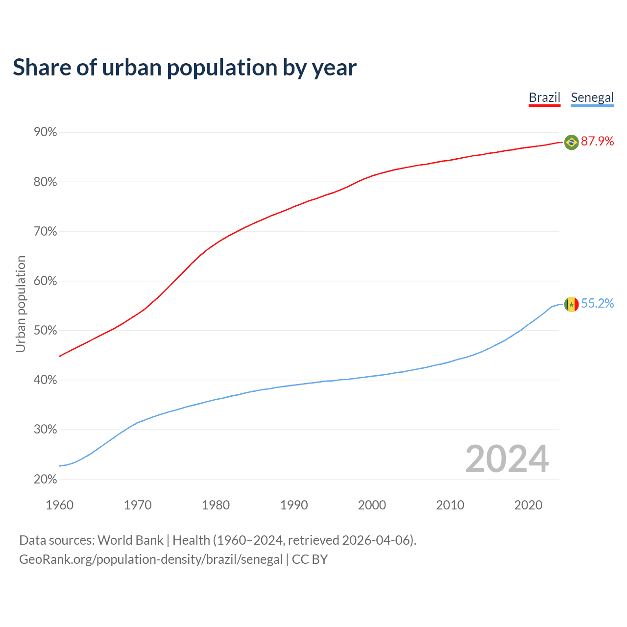 From 2004 to 2024, the share of urban population changed from 82.7% to 87.9% in Brazil and from 41.6% to 55.2% in Senegal.