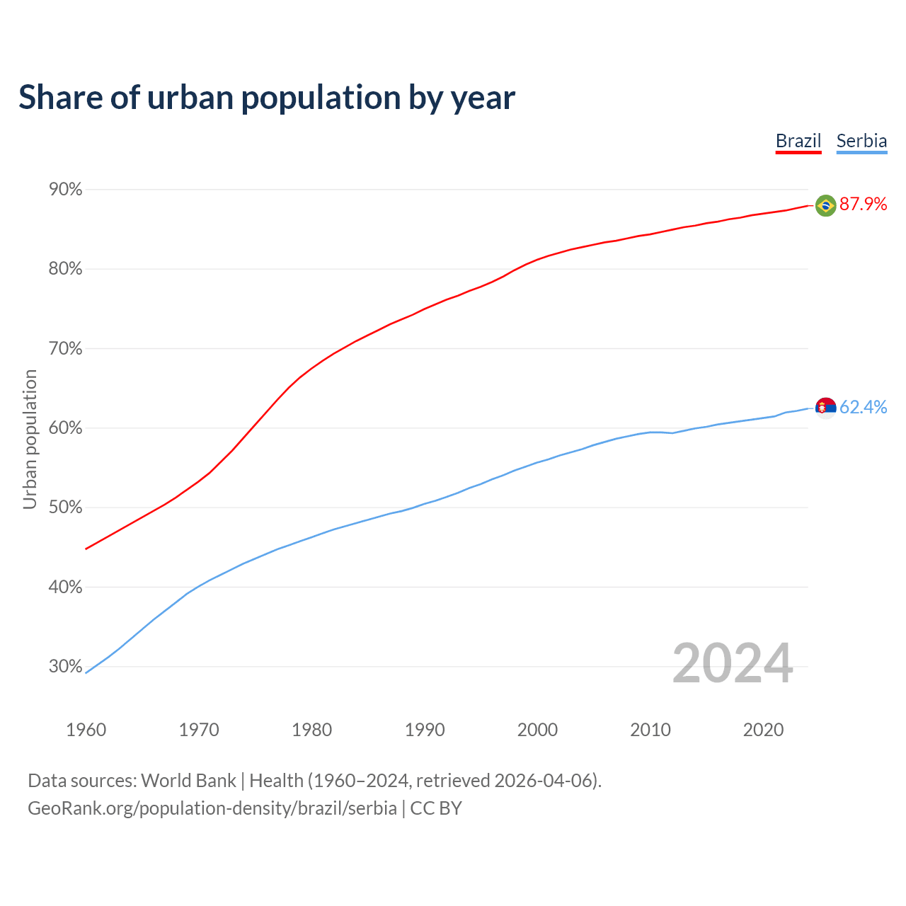 From 2004 to 2024, the share of urban population changed from 82.7% to 87.9% in Brazil and from 57.3% to 62.4% in Serbia.
