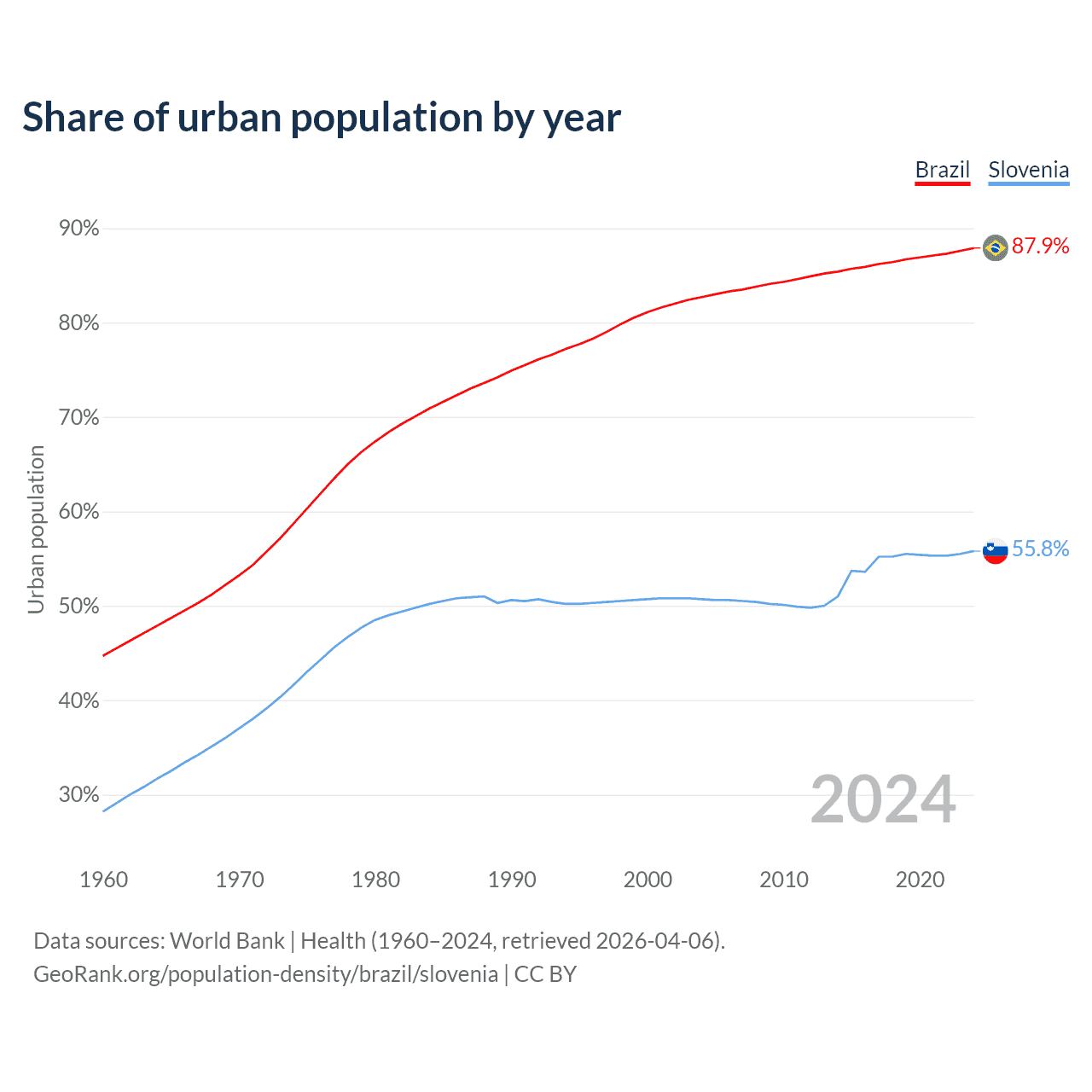 From 2004 to 2024, the share of urban population changed from 82.7% to 87.9% in Brazil and from 50.7% to 55.8% in Slovenia.