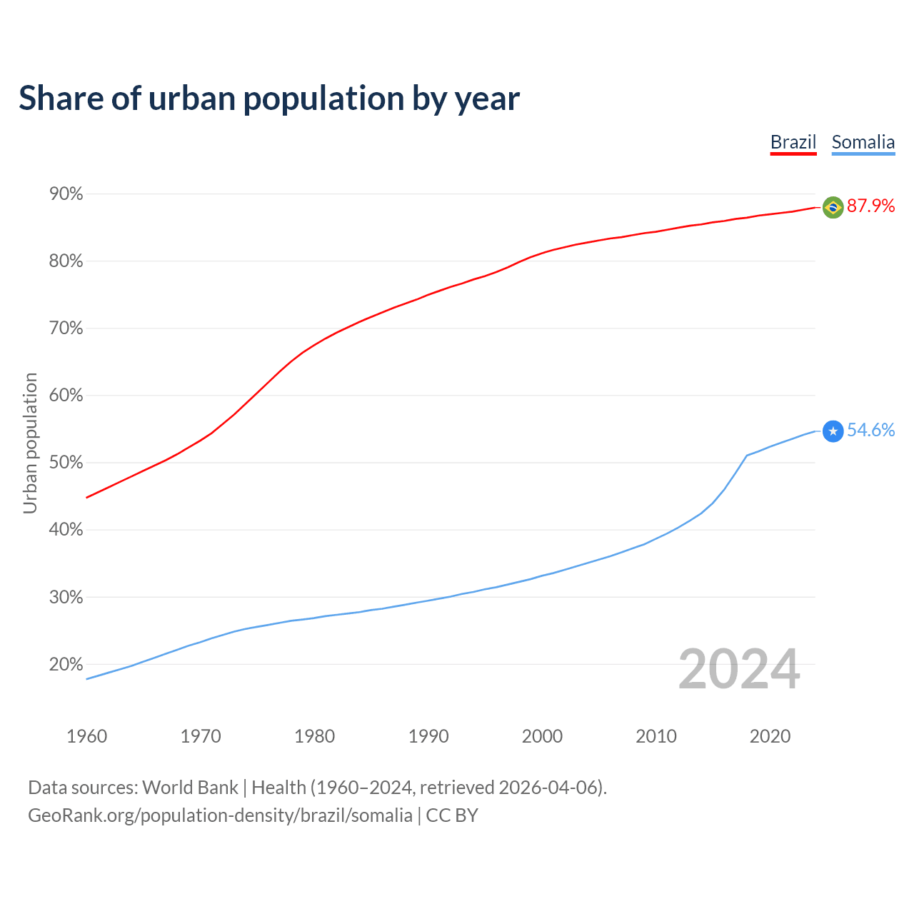 From 2004 to 2024, the share of urban population changed from 82.7% to 87.9% in Brazil and from 35% to 54.6% in Somalia.