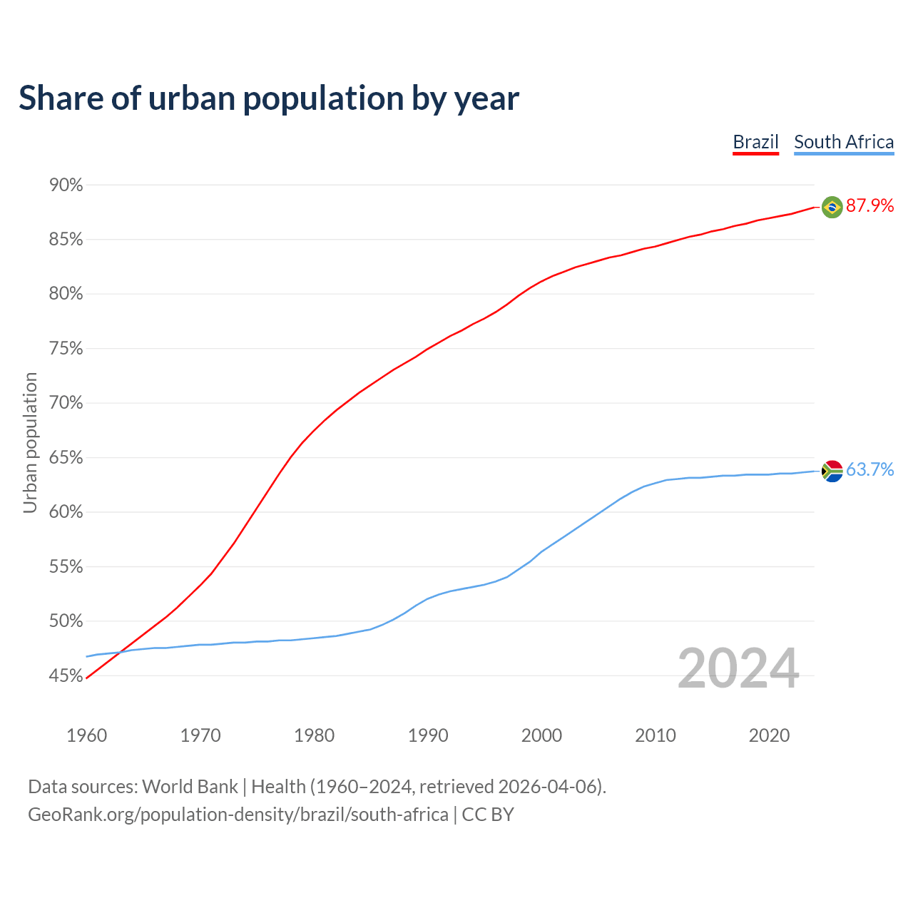 From 2004 to 2024, the share of urban population changed from 82.7% to 87.9% in Brazil and from 59.1% to 63.7% in South Africa.