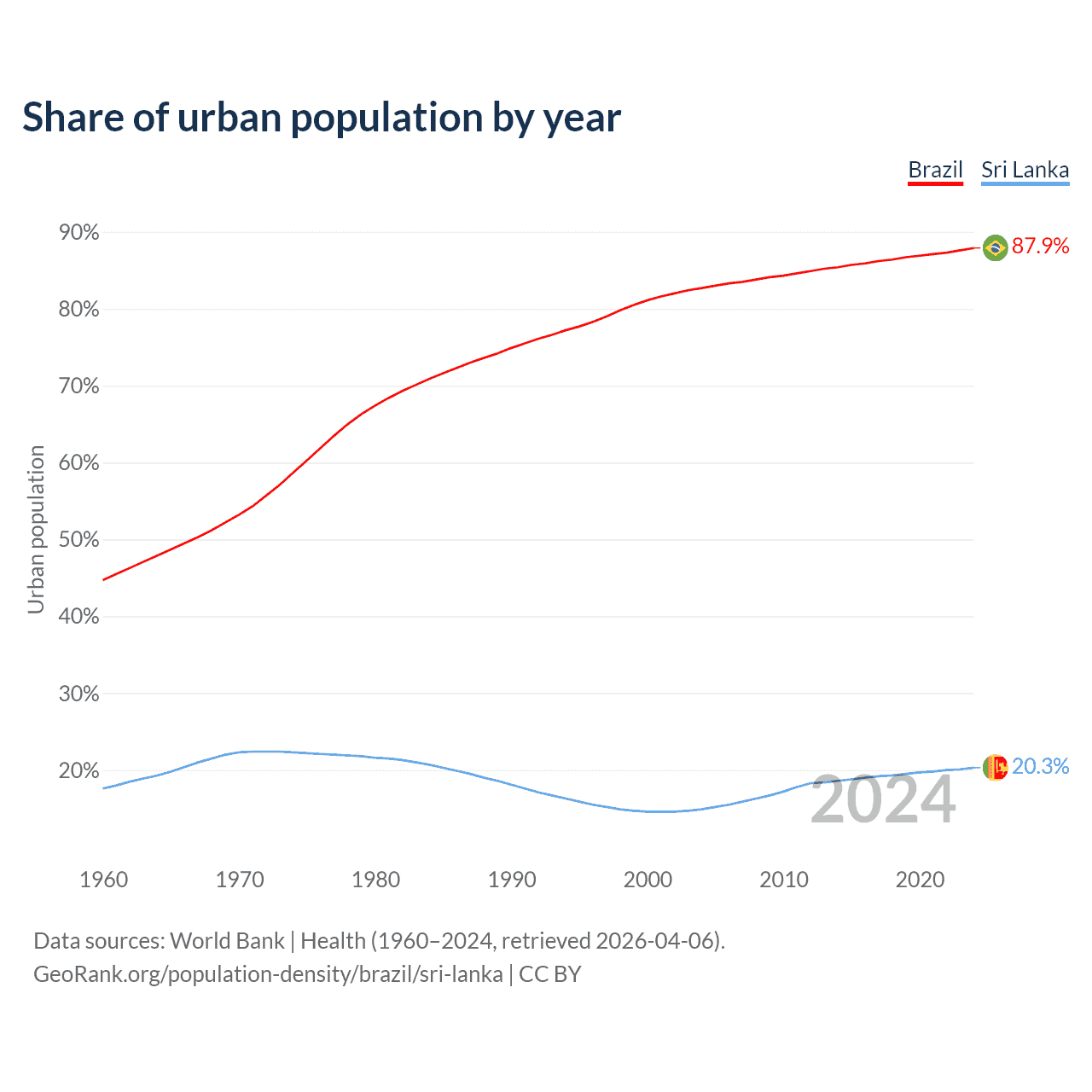 From 2004 to 2024, the share of urban population changed from 82.7% to 87.9% in Brazil and from 14.9% to 20.3% in Sri Lanka.