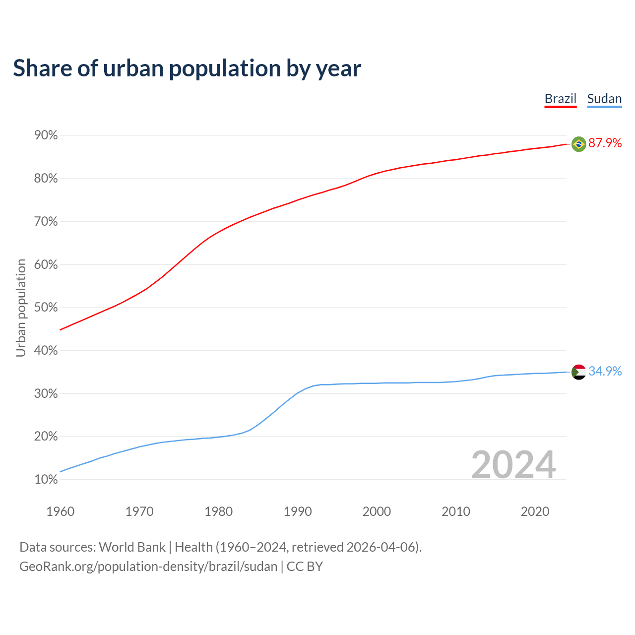 From 2004 to 2024, the share of urban population changed from 82.7% to 87.9% in Brazil and from 32.4% to 34.9% in Sudan.