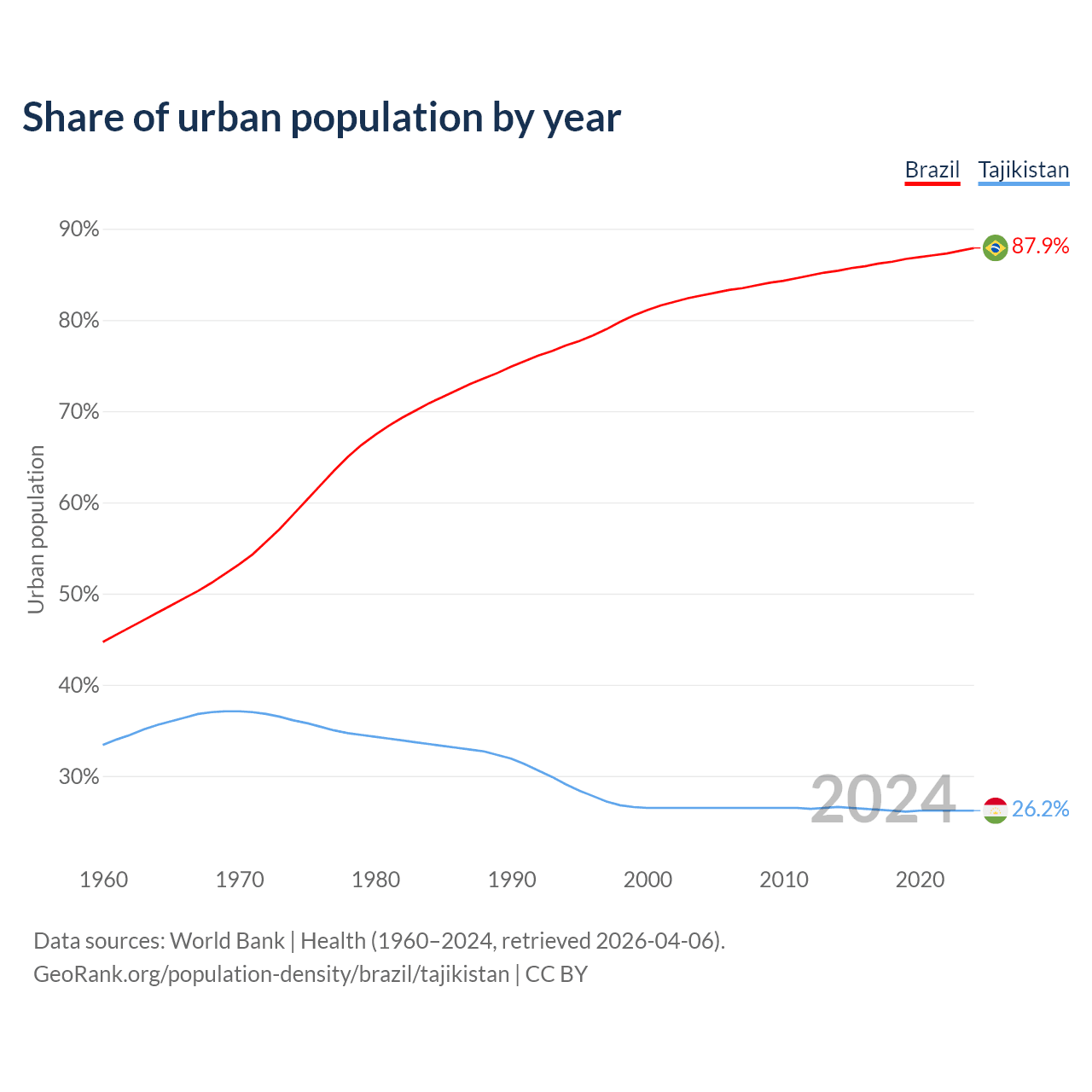 From 2004 to 2024, the share of urban population changed from 82.7% to 87.9% in Brazil and from 26.5% to 26.2% in Tajikistan.