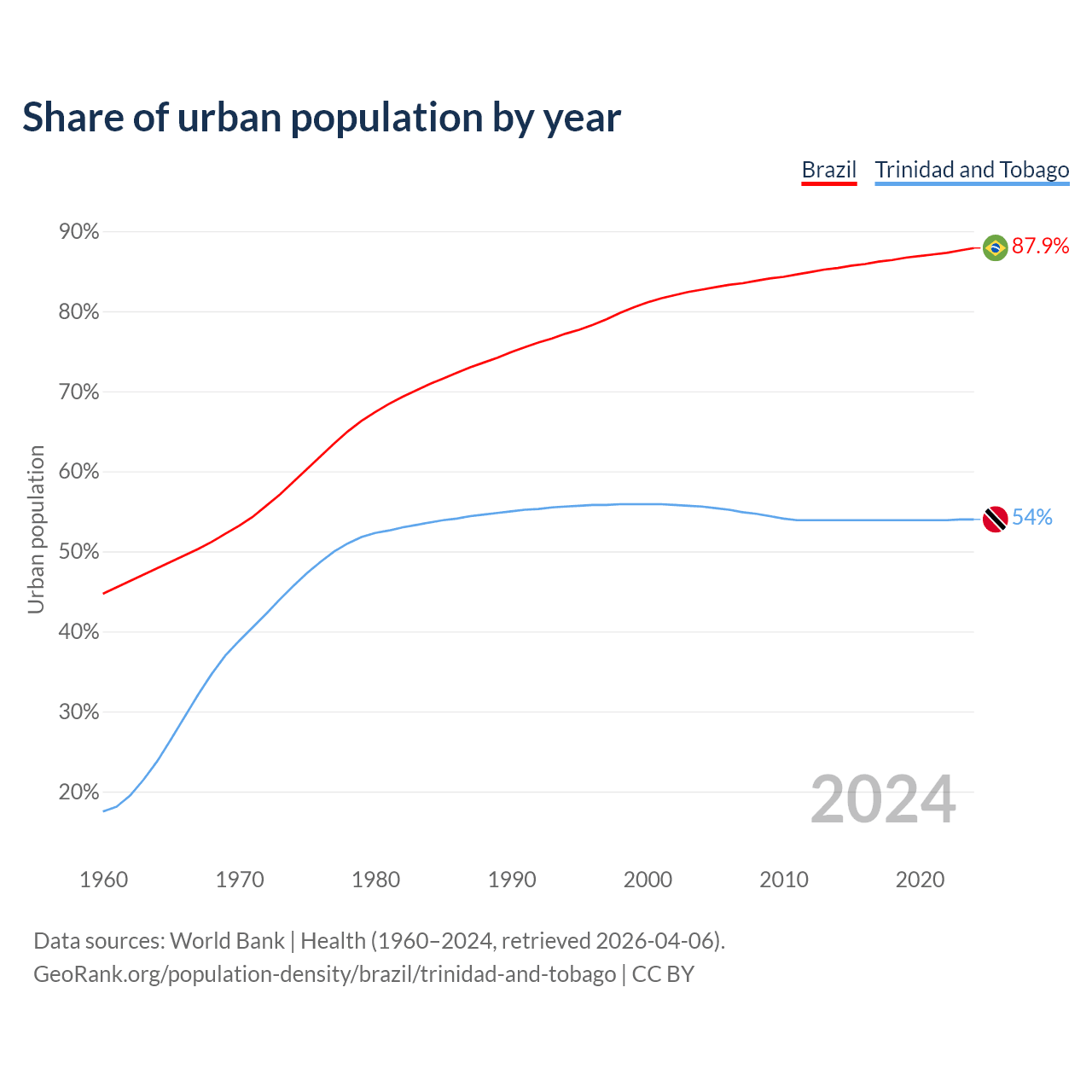 From 2004 to 2024, the share of urban population changed from 82.7% to 87.9% in Brazil and from 55.6% to 54% in Trinidad and Tobago.