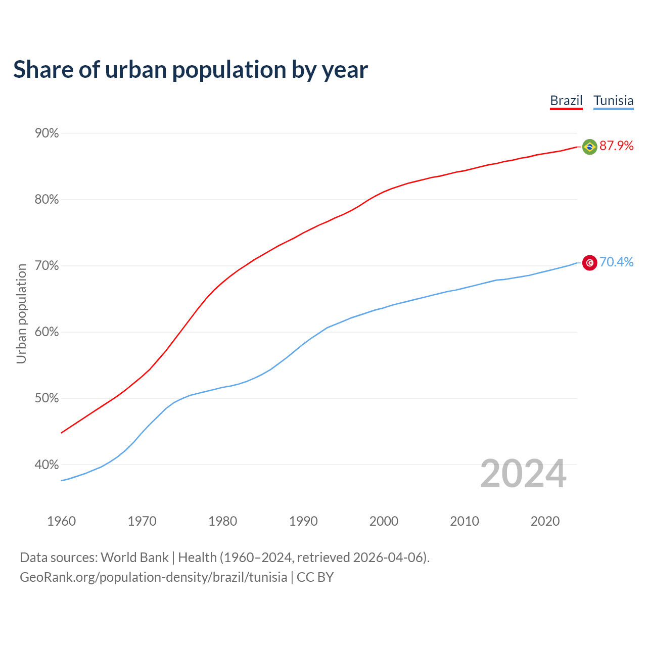From 2004 to 2024, the share of urban population changed from 82.7% to 87.9% in Brazil and from 64.9% to 70.4% in Tunisia.