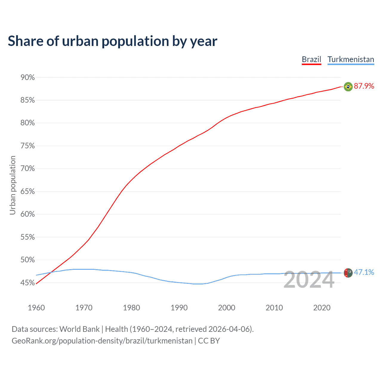 From 2004 to 2024, the share of urban population changed from 82.7% to 87.9% in Brazil and from 46.7% to 47.1% in Turkmenistan.