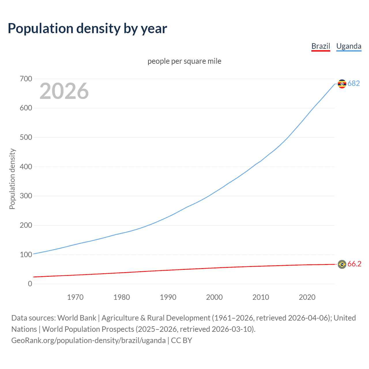 From 2006 to 2026, population density in Brazil increased by 14.5%, compared to a 82.7% growth in Uganda.