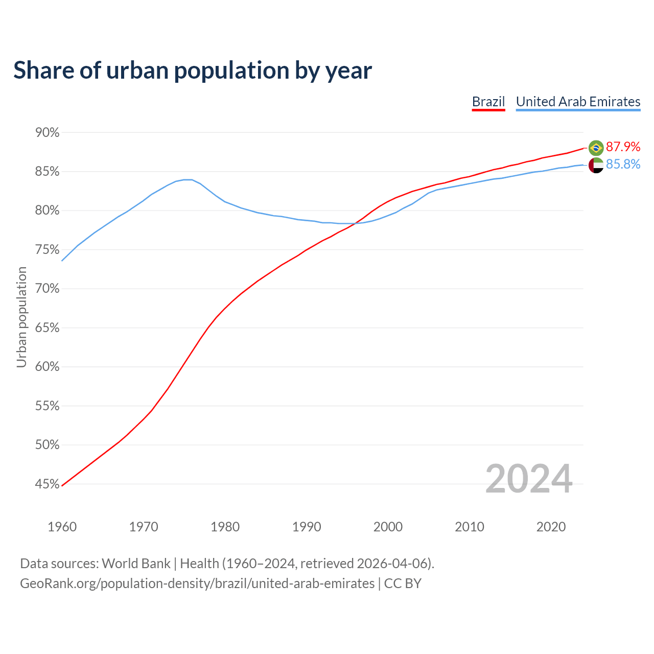 From 2004 to 2024, the share of urban population changed from 82.7% to 87.9% in Brazil and from 81.5% to 85.8% in the United Arab Emirates.