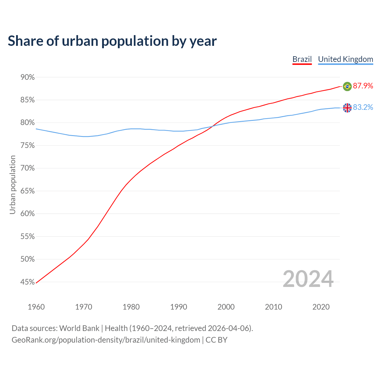 From 2004 to 2024, the share of urban population changed from 82.7% to 87.9% in Brazil and from 80.3% to 83.2% in the United Kingdom.