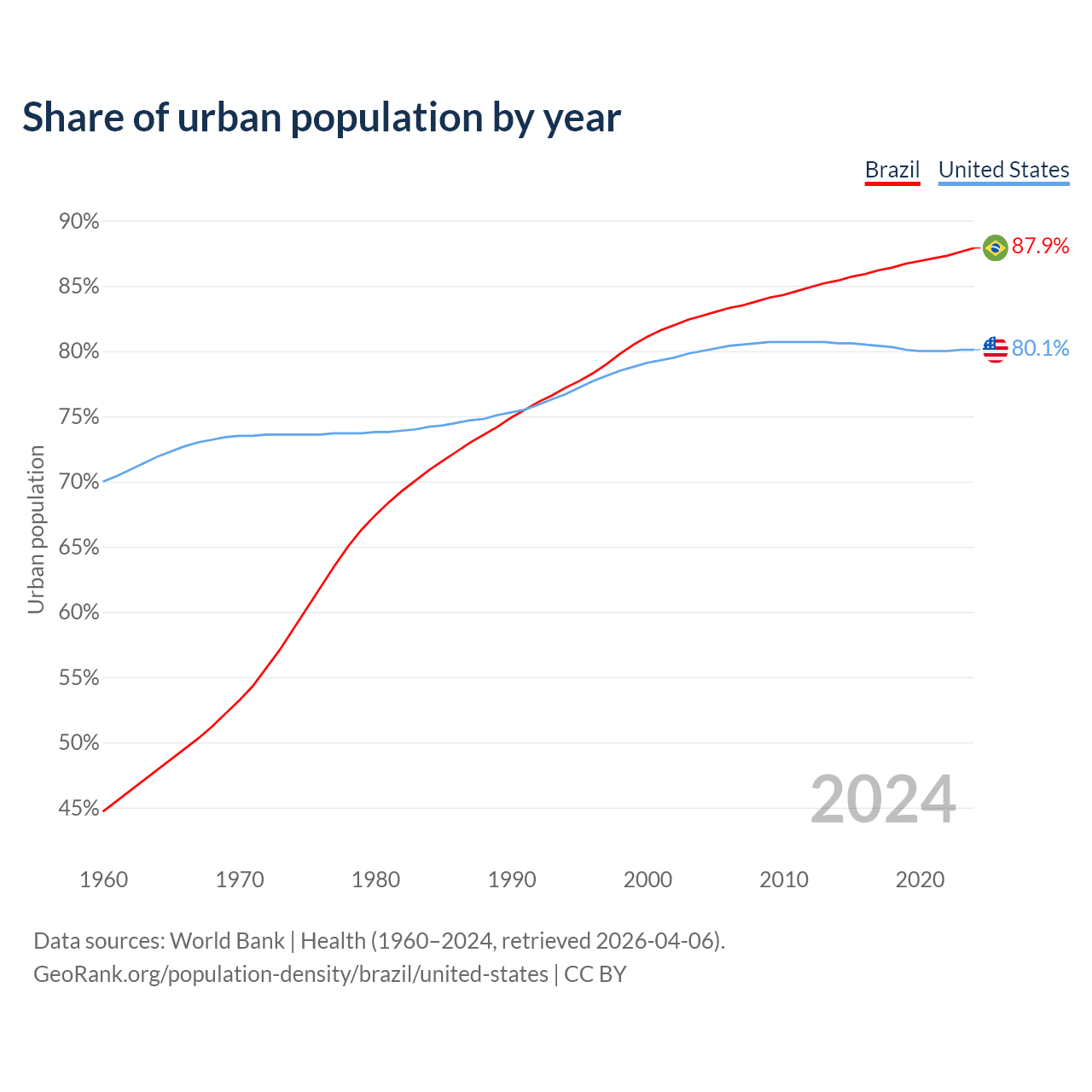 From 2004 to 2024, the share of urban population changed from 82.7% to 87.9% in Brazil and from 80% to 80.1% in the United States.