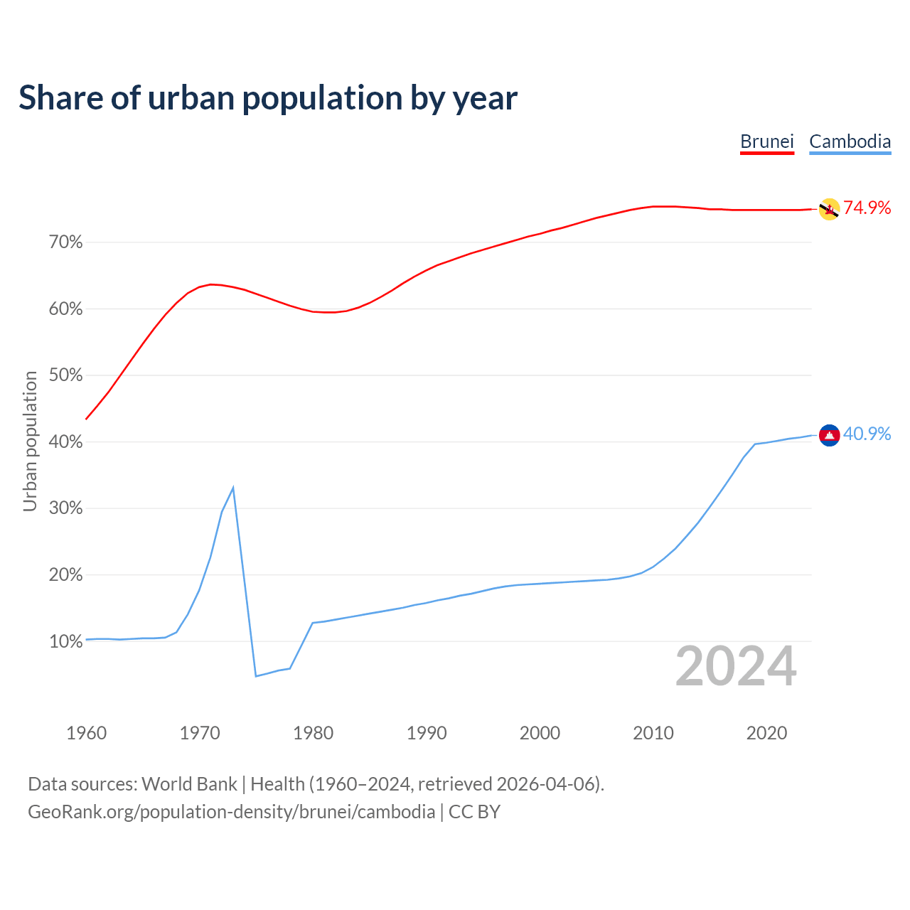 From 2004 to 2024, the share of urban population changed from 73.1% to 74.9% in Brunei and from 19% to 40.9% in Cambodia.