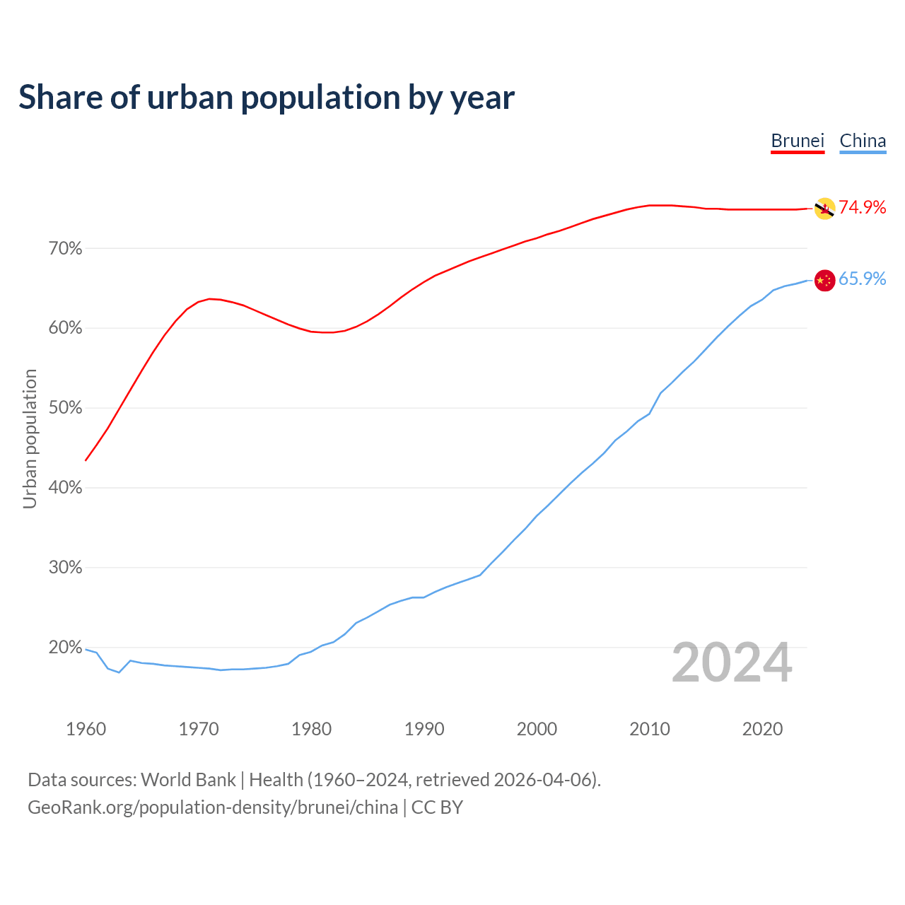 From 2004 to 2024, the share of urban population changed from 73.1% to 74.9% in Brunei and from 41.8% to 65.9% in China.