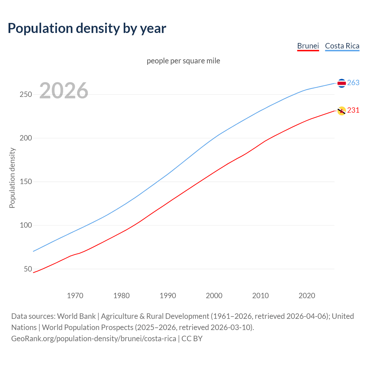 From 2006 to 2026, population density in Brunei increased by 28.9%, compared to a 19.8% growth in Costa Rica.