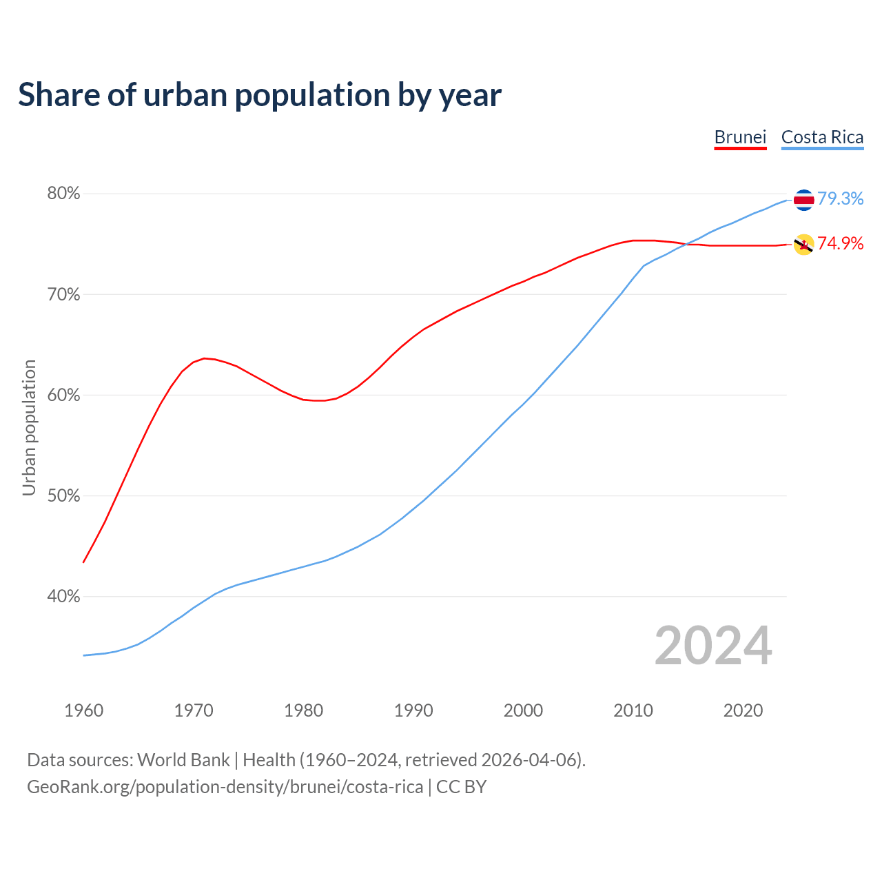 From 2004 to 2024, the share of urban population changed from 73.1% to 74.9% in Brunei and from 63.7% to 79.3% in Costa Rica.