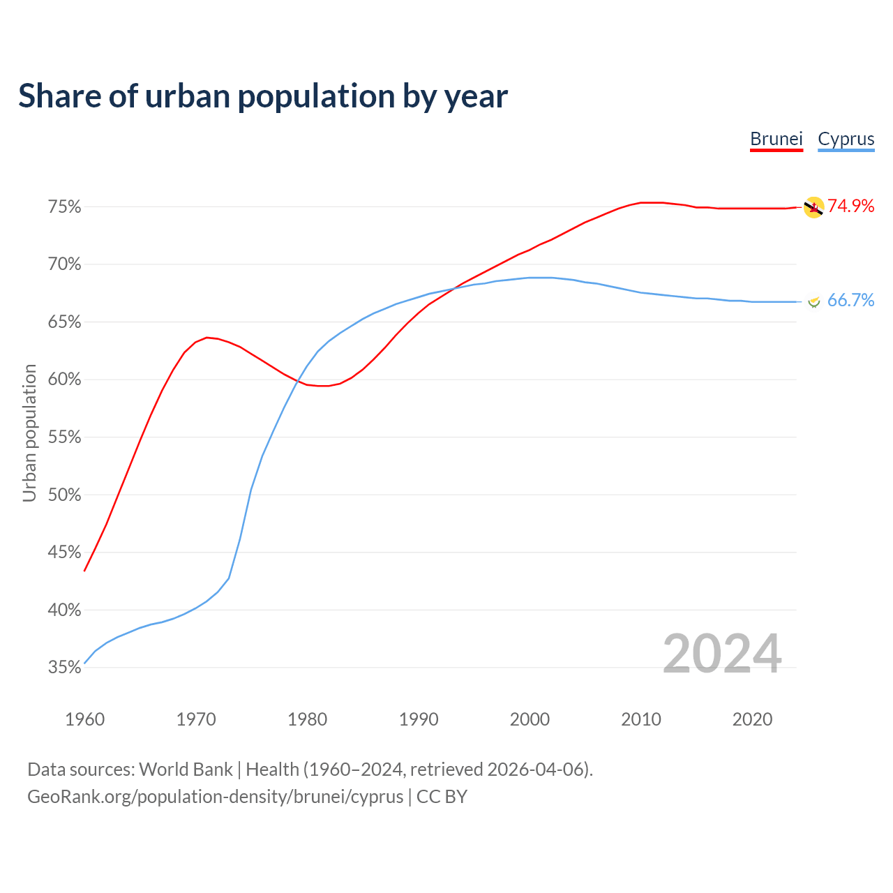 From 2004 to 2024, the share of urban population changed from 73.1% to 74.9% in Brunei and from 68.6% to 66.7% in Cyprus.
