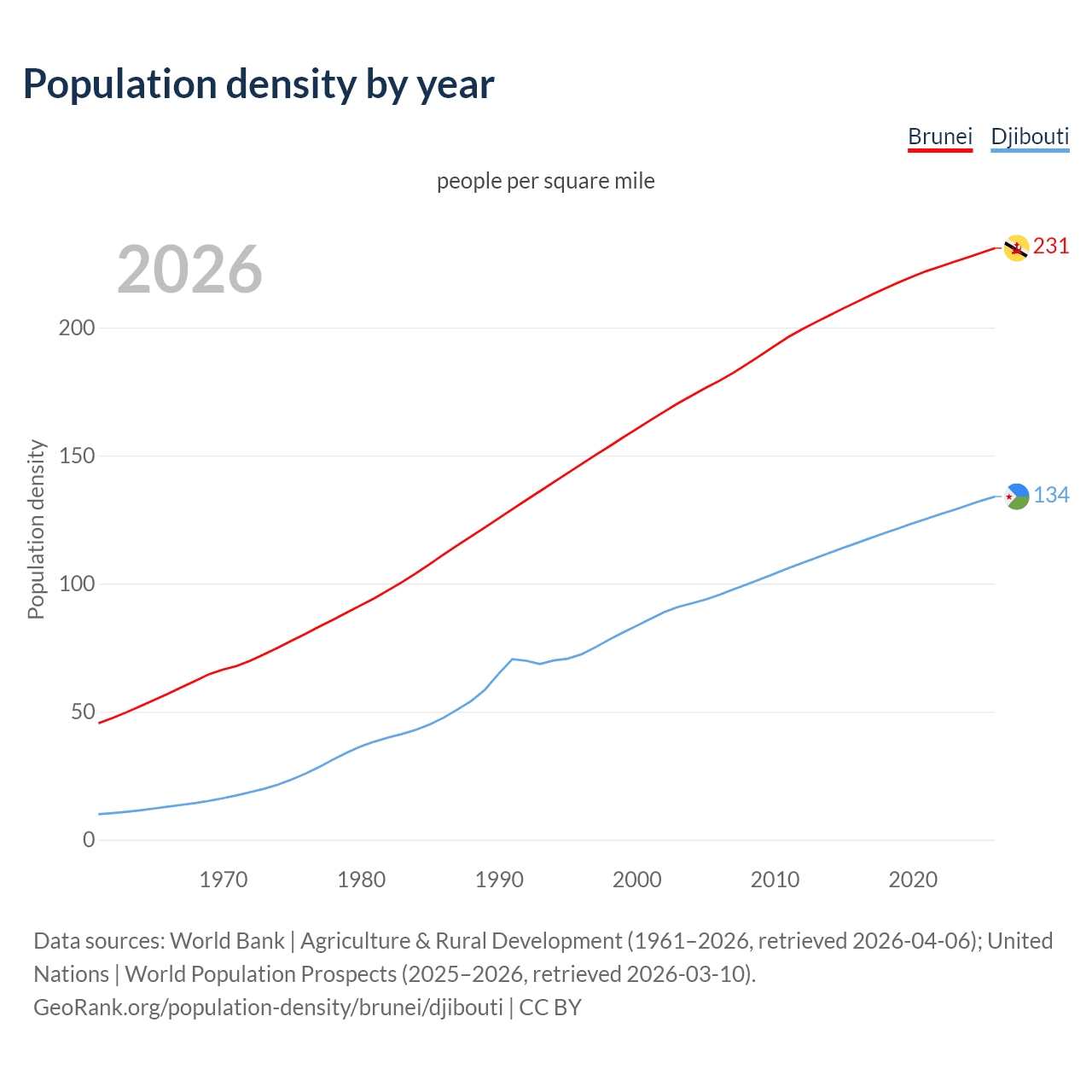 From 2006 to 2026, population density in Brunei increased by 28.9%, compared to a 40.2% growth in Djibouti.