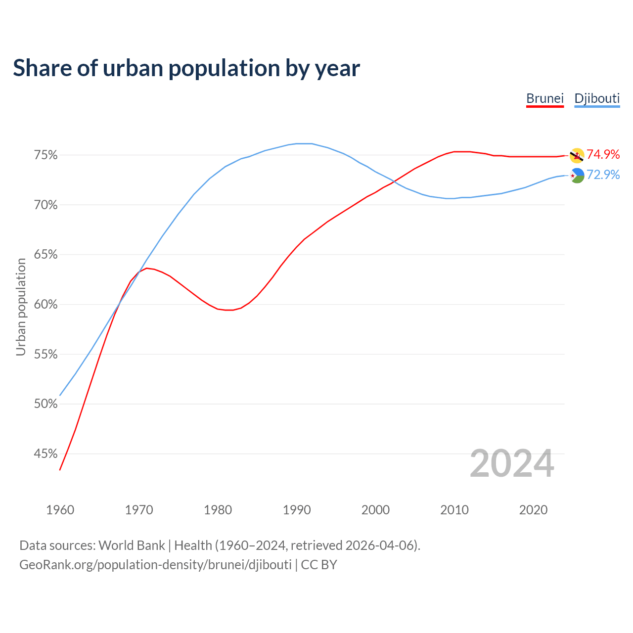 From 2004 to 2024, the share of urban population changed from 73.1% to 74.9% in Brunei and from 71.6% to 72.9% in Djibouti.