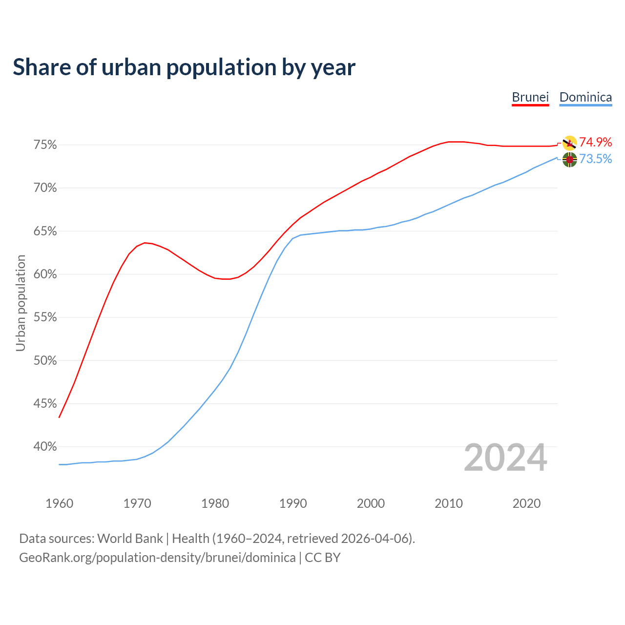 From 2004 to 2024, the share of urban population changed from 73.1% to 74.9% in Brunei and from 66% to 73.5% in Dominica.