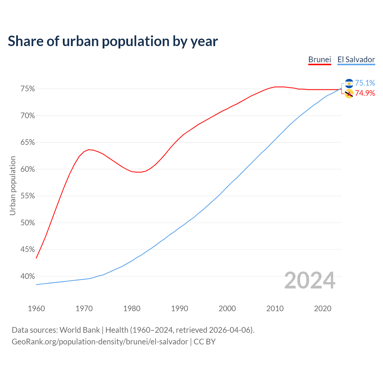 From 2004 to 2024, the share of urban population changed from 73.1% to 74.9% in Brunei and from 60.1% to 75.1% in El Salvador.