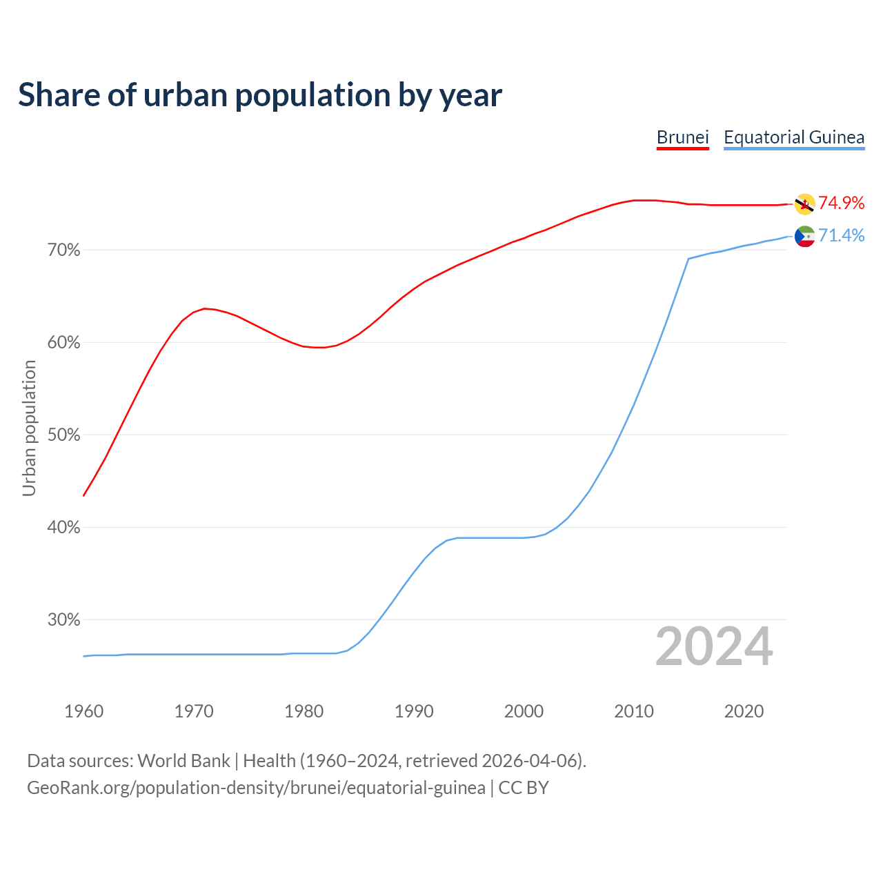 From 2004 to 2024, the share of urban population changed from 73.1% to 74.9% in Brunei and from 40.9% to 71.4% in Equatorial Guinea.