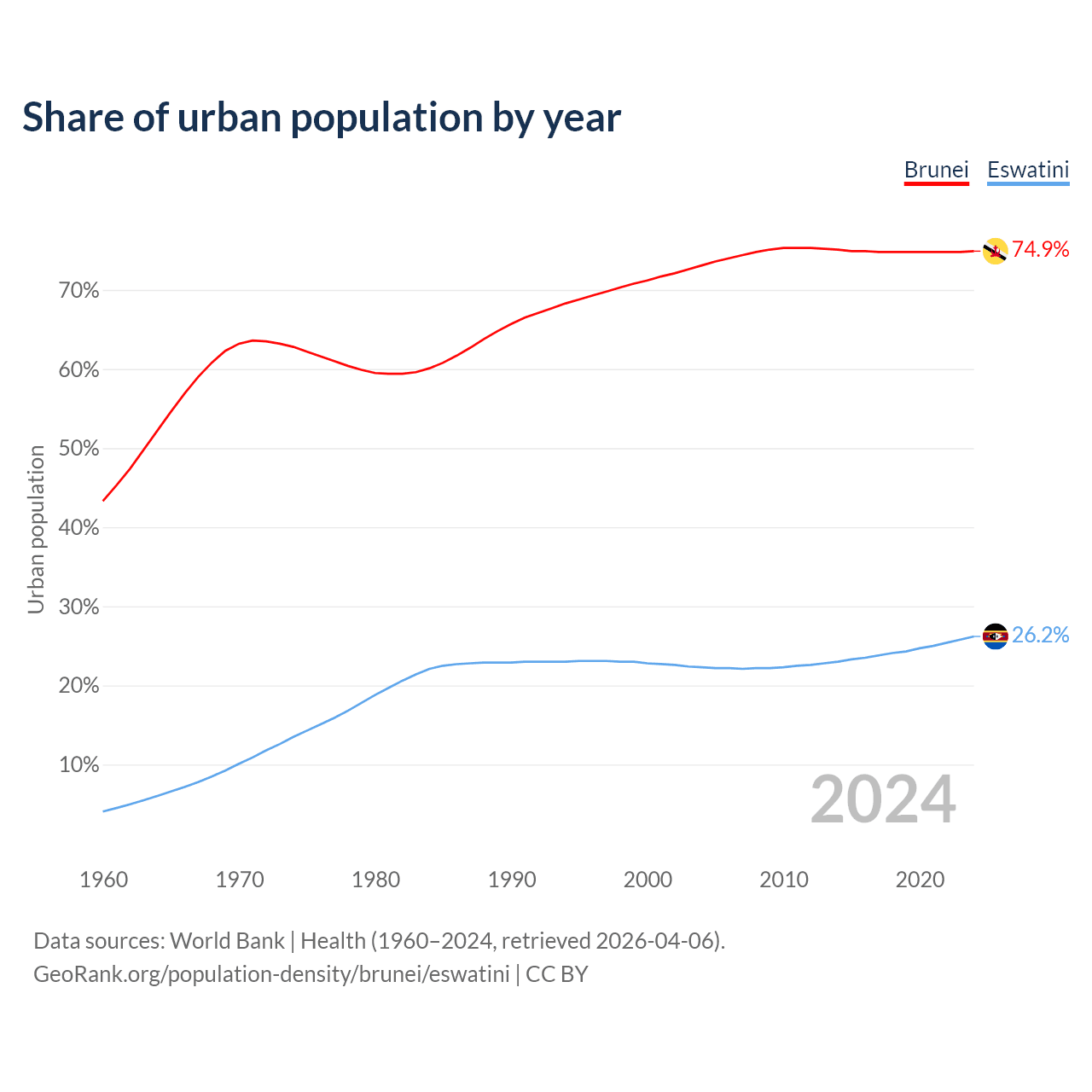 From 2004 to 2024, the share of urban population changed from 73.1% to 74.9% in Brunei and from 22.3% to 26.2% in Eswatini.