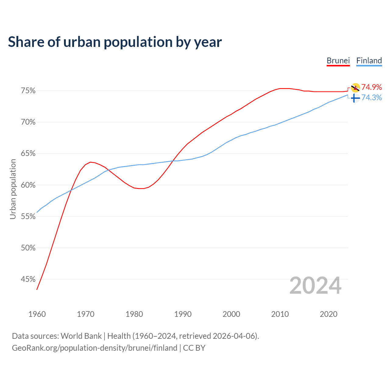 From 2004 to 2024, the share of urban population changed from 73.1% to 74.9% in Brunei and from 68.3% to 74.3% in Finland.