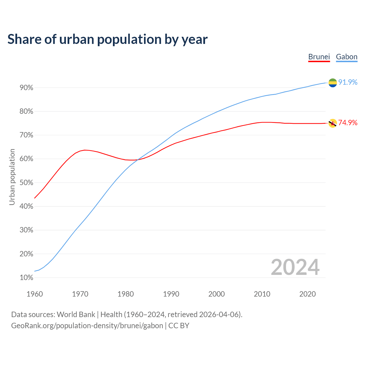 From 2004 to 2024, the share of urban population changed from 73.1% to 74.9% in Brunei and from 82.7% to 91.9% in Gabon.