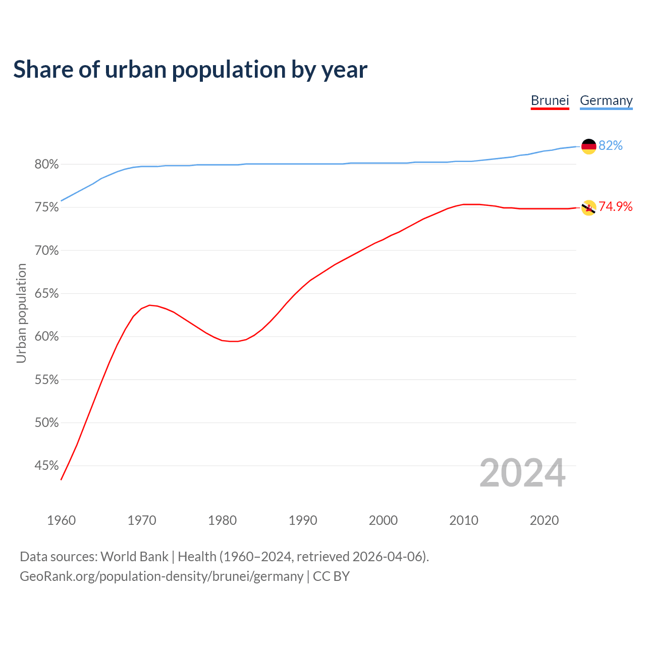 From 2004 to 2024, the share of urban population changed from 73.1% to 74.9% in Brunei and from 80.2% to 82% in Germany.