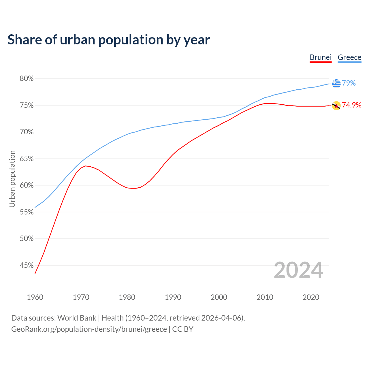 From 2004 to 2024, the share of urban population changed from 73.1% to 74.9% in Brunei and from 73.8% to 79% in Greece.