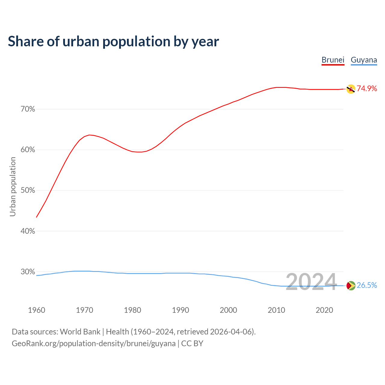 From 2004 to 2024, the share of urban population changed from 73.1% to 74.9% in Brunei and from 28.1% to 26.5% in Guyana.