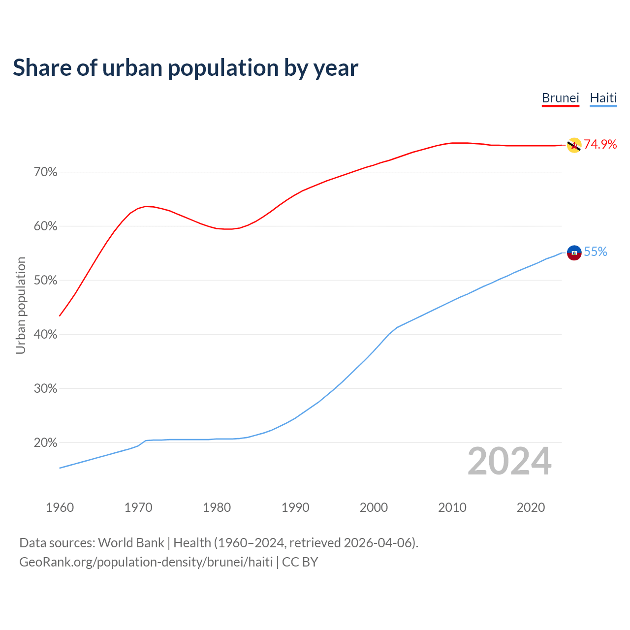 From 2004 to 2024, the share of urban population changed from 73.1% to 74.9% in Brunei and from 41.9% to 55% in Haiti.