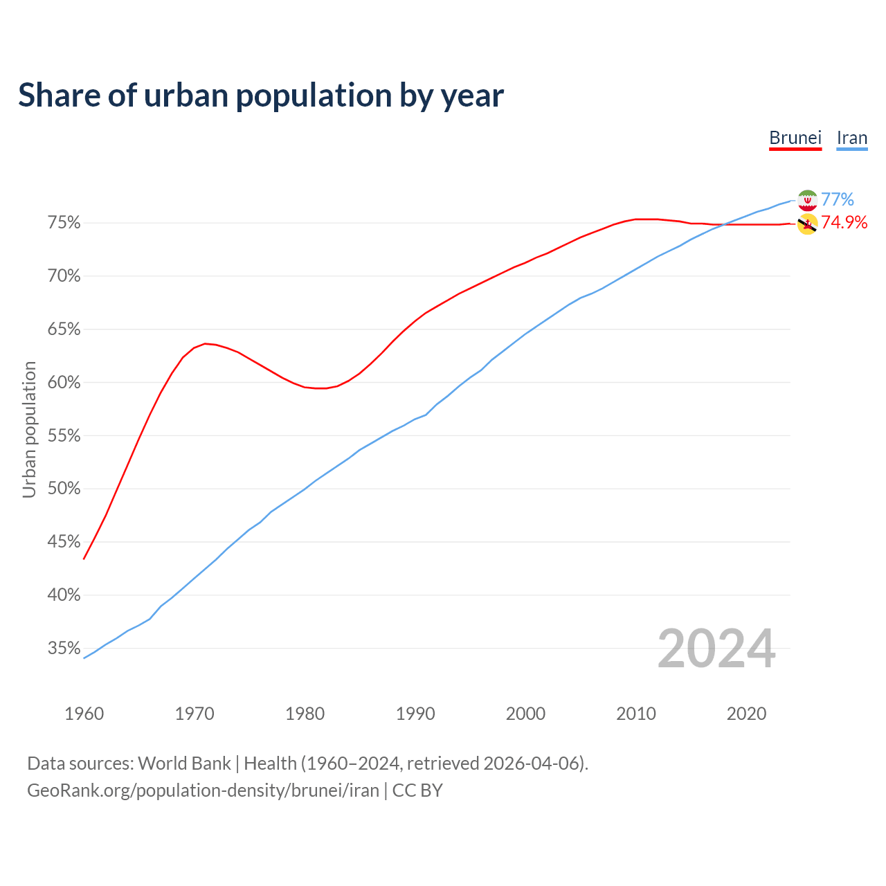 From 2004 to 2024, the share of urban population changed from 73.1% to 74.9% in Brunei and from 67.3% to 77% in Iran.