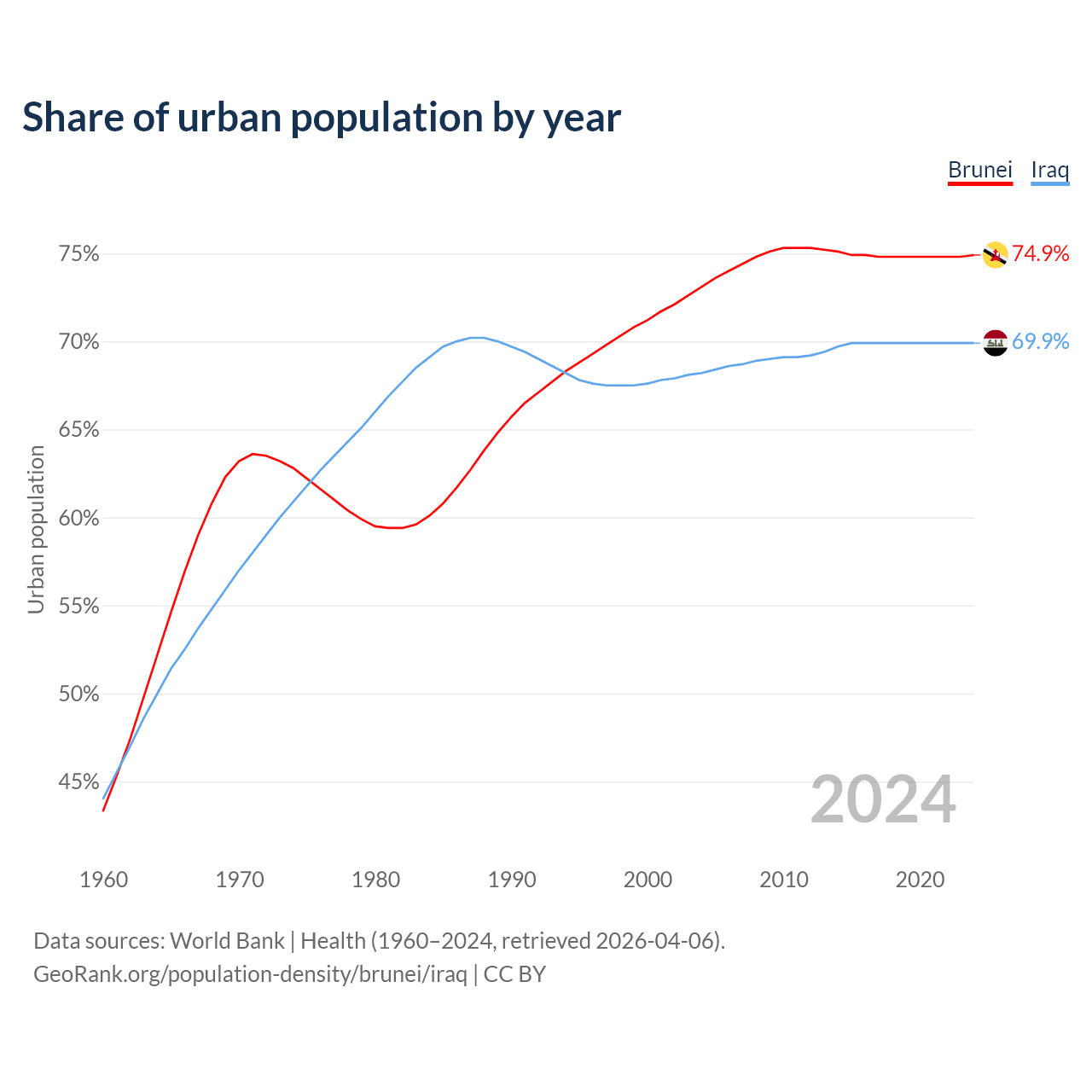 From 2004 to 2024, the share of urban population changed from 73.1% to 74.9% in Brunei and from 68.2% to 69.9% in Iraq.