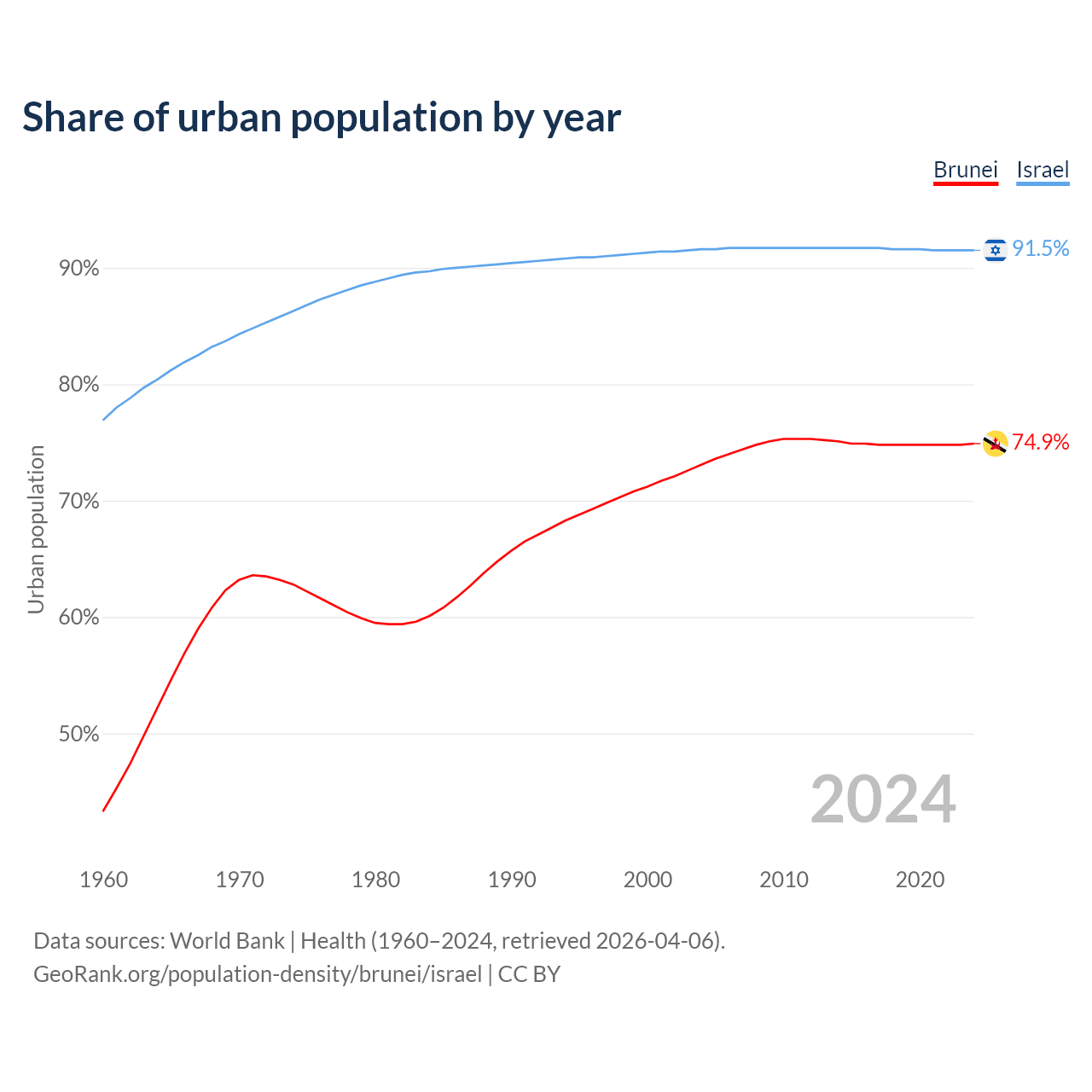 From 2004 to 2024, the share of urban population changed from 73.1% to 74.9% in Brunei and from 91.6% to 91.5% in Israel.
