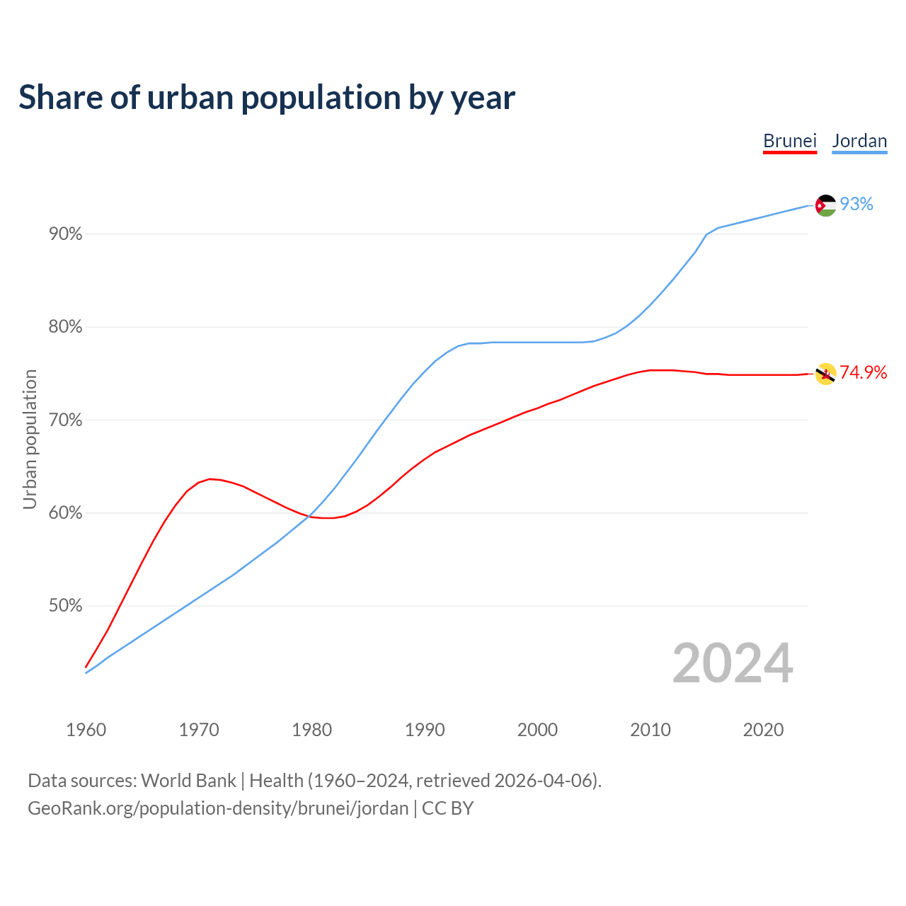 From 2004 to 2024, the share of urban population changed from 73.1% to 74.9% in Brunei and from 78.3% to 93% in Jordan.