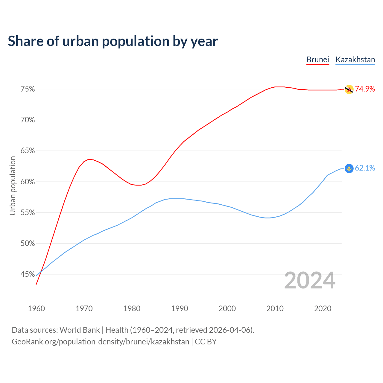 From 2004 to 2024, the share of urban population changed from 73.1% to 74.9% in Brunei and from 54.9% to 62.1% in Kazakhstan.