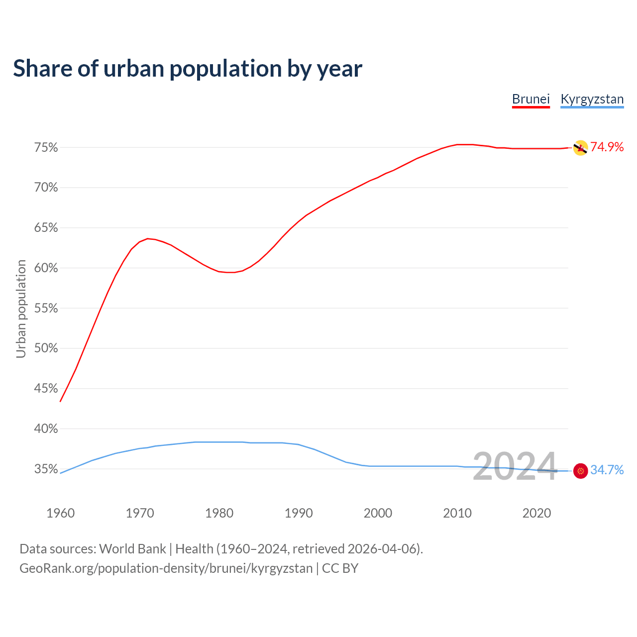 From 2004 to 2024, the share of urban population changed from 73.1% to 74.9% in Brunei and from 35.3% to 34.7% in Kyrgyzstan.