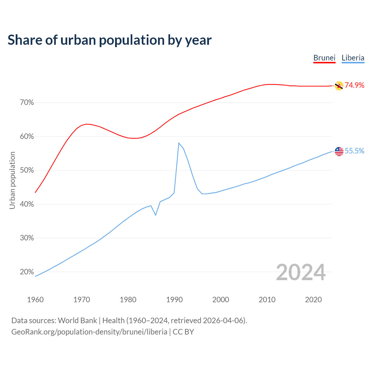 From 2004 to 2024, the share of urban population changed from 73.1% to 74.9% in Brunei and from 45.4% to 55.5% in Liberia.
