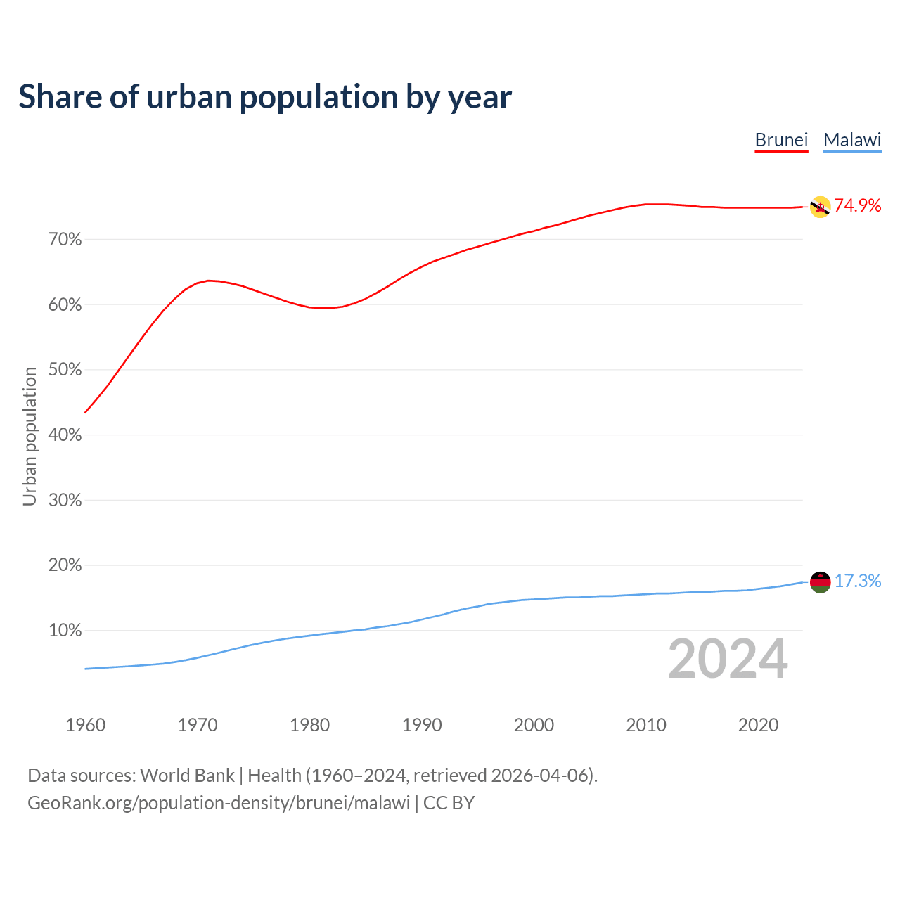 From 2004 to 2024, the share of urban population changed from 73.1% to 74.9% in Brunei and from 15% to 17.3% in Malawi.