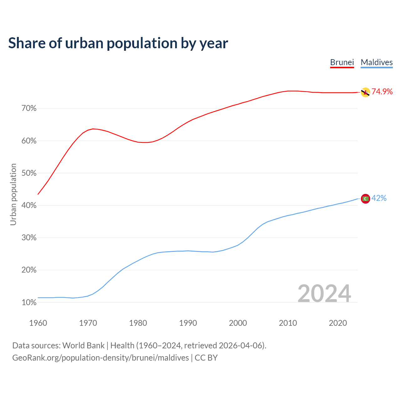 From 2004 to 2024, the share of urban population changed from 73.1% to 74.9% in Brunei and from 32.9% to 42% in Maldives.
