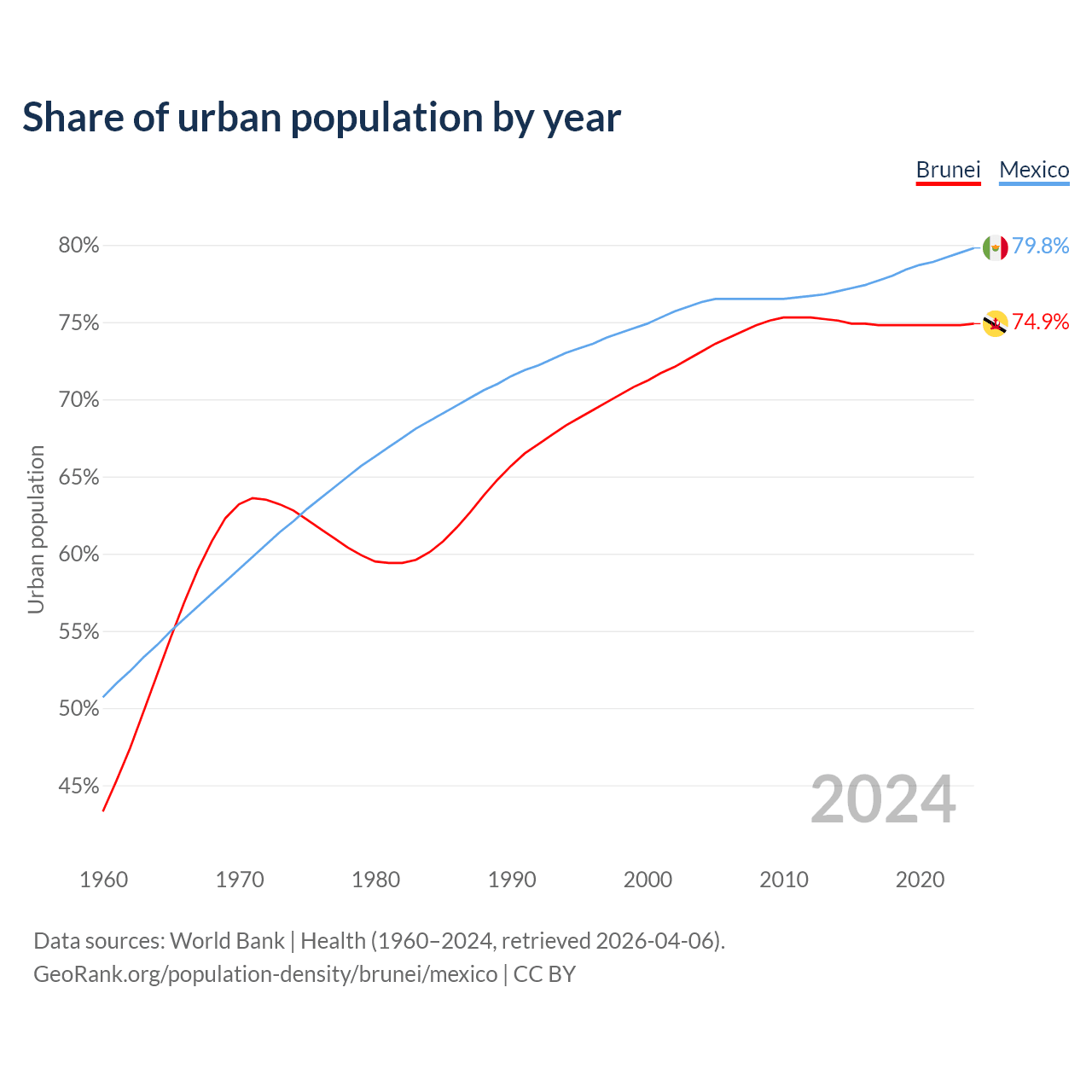 From 2004 to 2024, the share of urban population changed from 73.1% to 74.9% in Brunei and from 76.3% to 79.8% in Mexico.