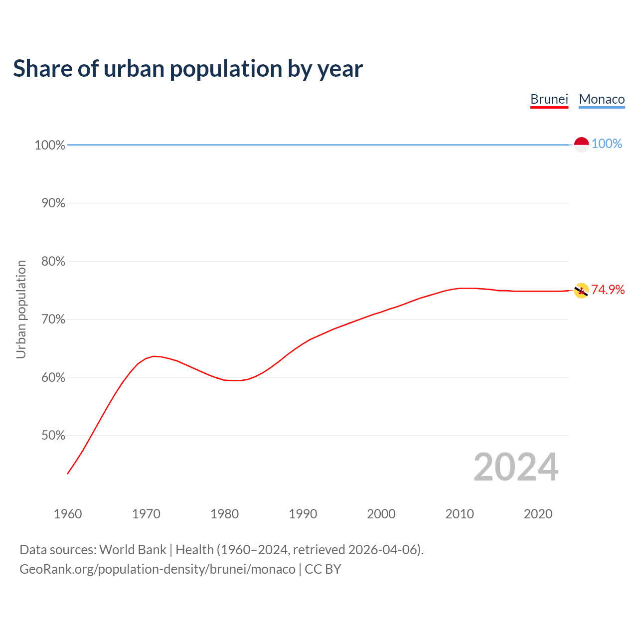 From 2004 to 2024, the share of urban population changed from 73.1% to 74.9% in Brunei and from 100% to 100% in Monaco.