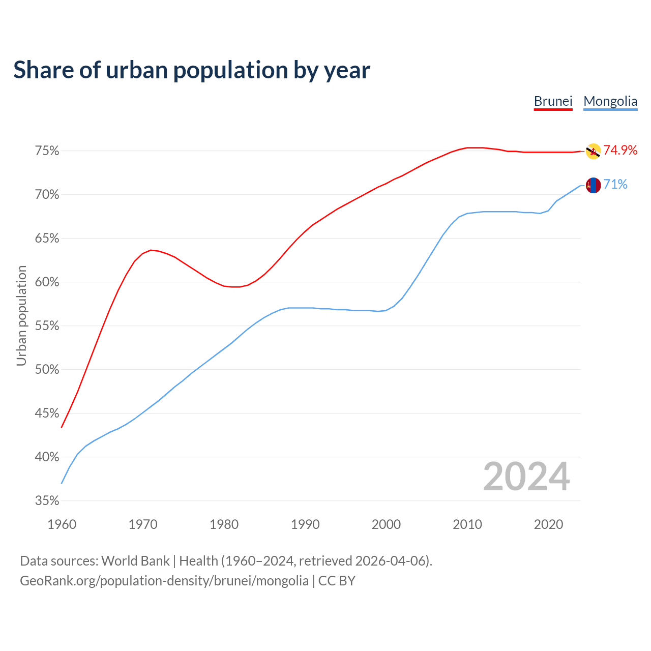 From 2004 to 2024, the share of urban population changed from 73.1% to 74.9% in Brunei and from 60.8% to 71% in Mongolia.