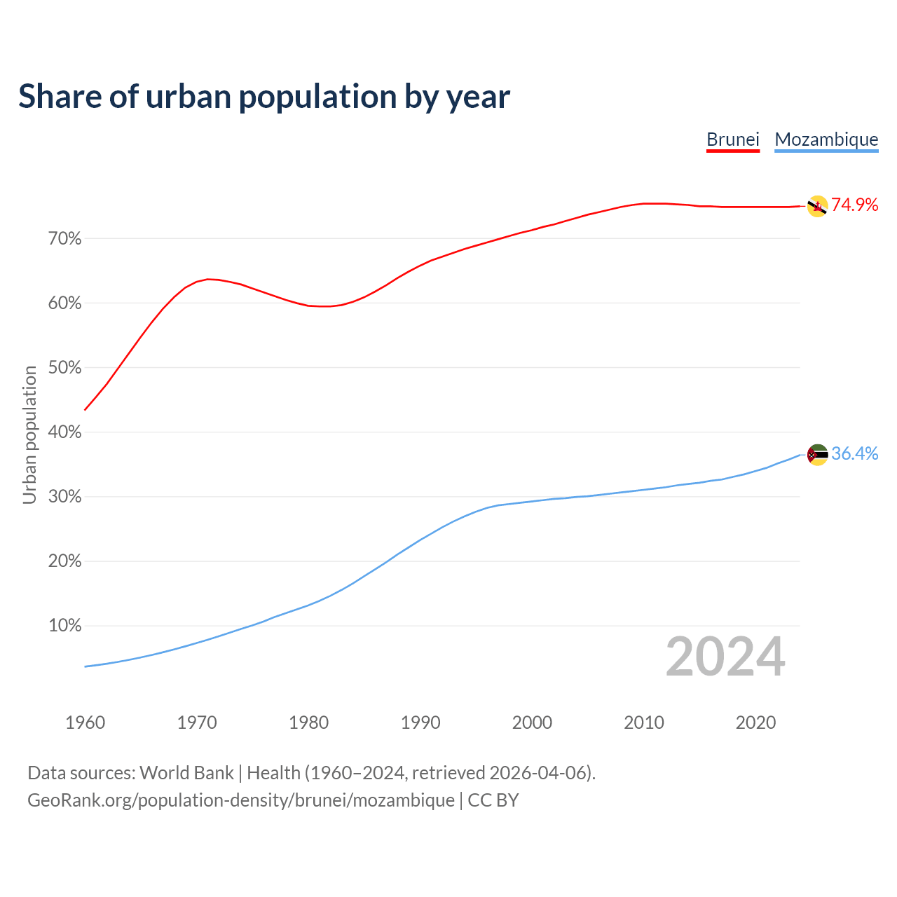 From 2004 to 2024, the share of urban population changed from 73.1% to 74.9% in Brunei and from 29.9% to 36.4% in Mozambique.