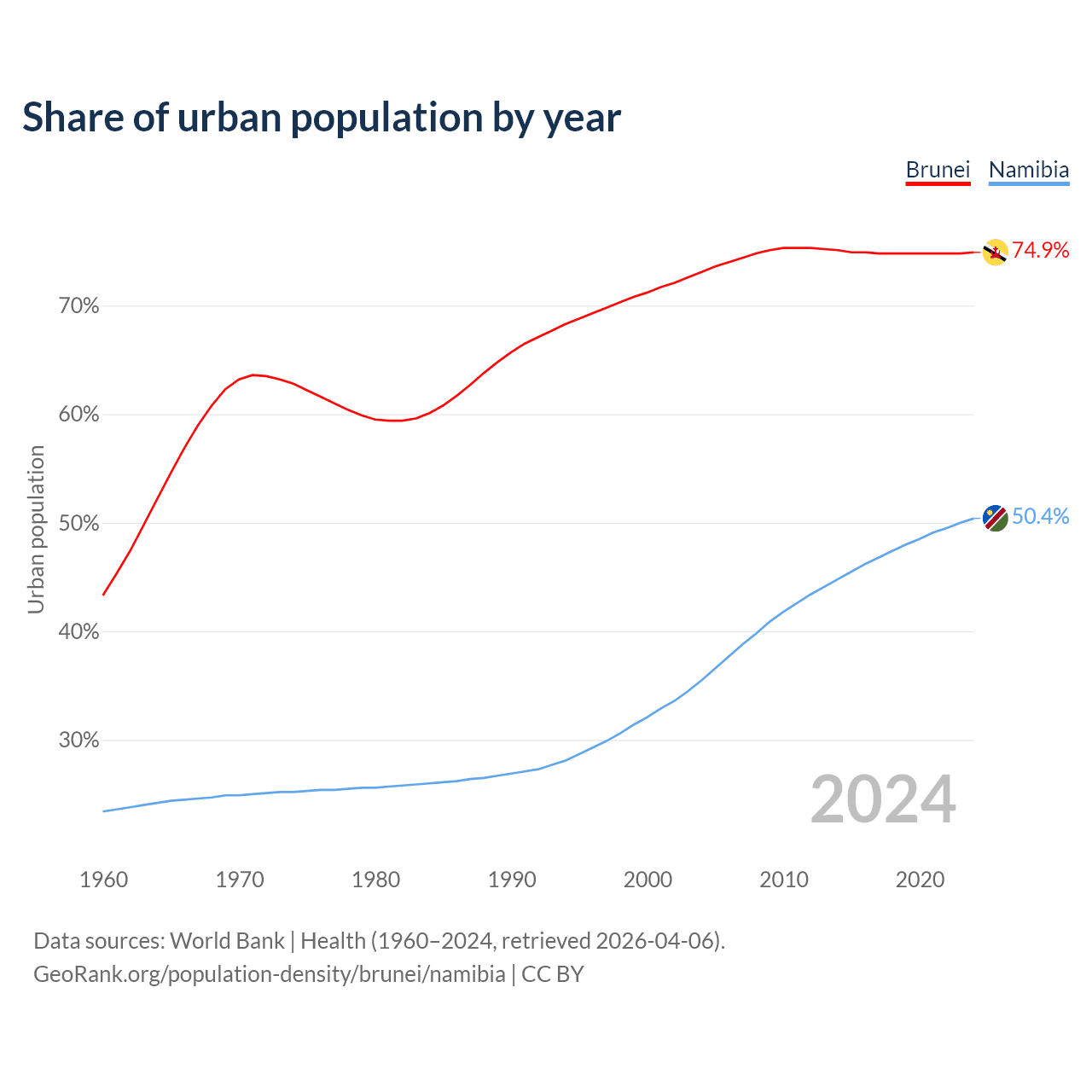 From 2004 to 2024, the share of urban population changed from 73.1% to 74.9% in Brunei and from 35.5% to 50.4% in Namibia.